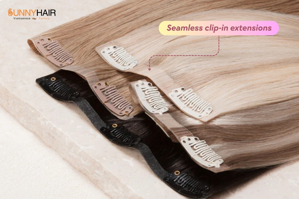Compared to regular clip-ins, seamless extensions are thinner, lighter, and more comfortable, making them a top choice for professionals and premium hair brands. You can find them in different styles—Remy human hair, virgin hair, or high-quality synthetic fibers—depending on your target market and price range.